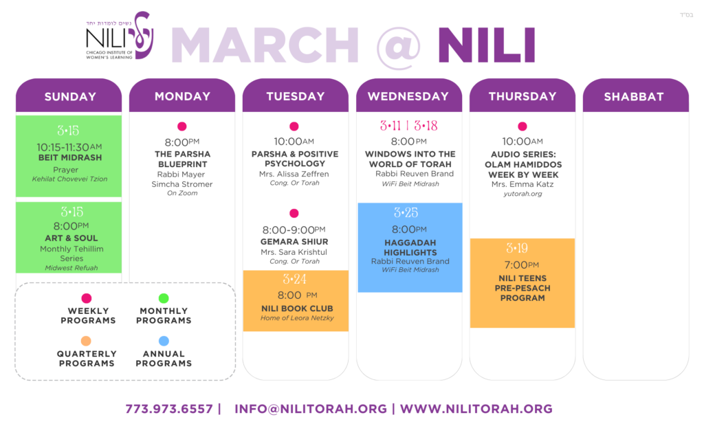 NILI, the Chicago Institute of Women’s Learning, is a community of learning offering engaging, challenging and inspirational Torah-based classes and programs tailored to the specific needs and interests of women.